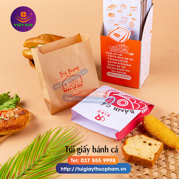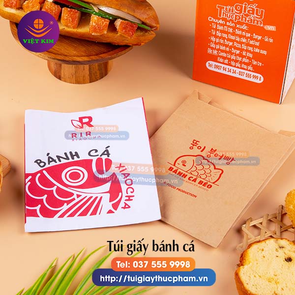 Túi giấy bánh cá nướng được làm từ giấy kraft nâu hoặc giấy thấm dầu trắng.