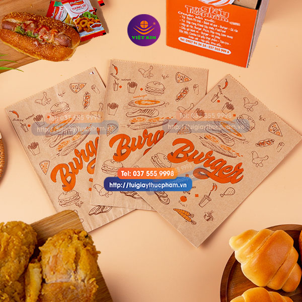 Túi giấy đựng bánh burger thường được in ấn với các hình ảnh, logo, thông tin về sản phẩm hay thương hiệu của nhà sản xuất. Điều này giúp quảng bá thương hiệu và thu hút sự chú ý của khách hàng.